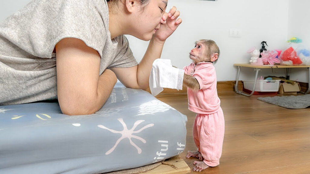 When Mom wasn’t feeling well, little Lala the monkey instantly noticed something was different. Instead of her usual laughter and playful games, Mom was lying down, looking tired and weak. Lala tilted her head, blinking those curious eyes as if to ask, “Mom, are you okay?” What happened next melted everyone’s hearts—Lala decided she would take care of Mom all by herself