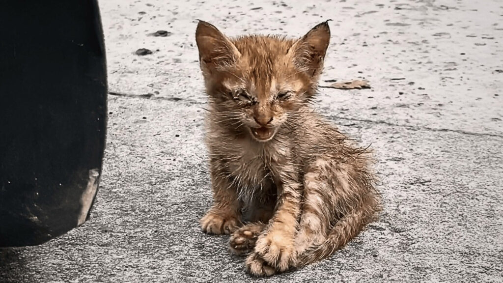 In the cold shadow of a deserted alley, a tiny stray kitten lay curled up beside a pile of old boxes. Its fur, once soft and clean, was now clumped with dirt and dust. Two swollen eyes glistened with infection, barely open, and yet they held a faint, desperate sparkle of life. The kitten didn’t meow—it was too weak even for that. It only trembled, pressing its frail body against the cold wall, silently crying for warmth, for a gentle hand, for someone to notice.
