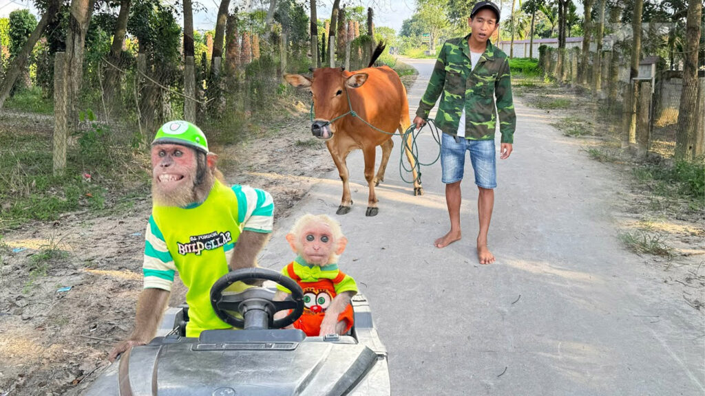 It was a bright and breezy morning on the little farm, and Mom had a simple mission for the day—take the cow to a nearby field for a special check-up. She called out cheerfully, “Cutis! Baby monkey! Come help me lead the cow!” Normally, both of them were full of excitement whenever there was a new task. But today… things didn’t go quite as planned.