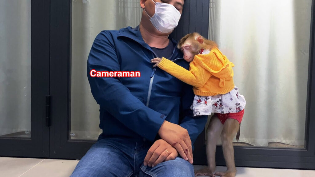 At one point, a neighbor passed by and laughed softly at the adorable scene—Monkey Lyly and the cameraman sitting side by side like two friends stranded outside. The cameraman tried to explain the situation, but Lyly stole the show with her calm posture, her tail neatly wrapped around her legs.