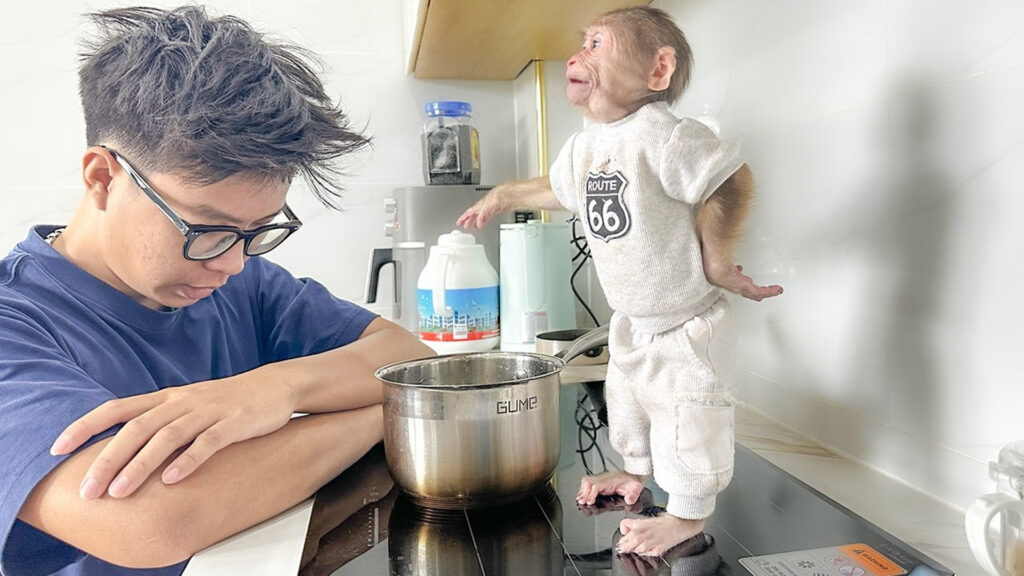 It was a peaceful morning in the house until the unmistakable smell of something burning drifted through the air. Lala, the clever little monkey with curious eyes, immediately raised her head. Her nose twitched as she sniffed the smoky scent coming from the kitchen. “That doesn’t smell like breakfast…” she thought, tilting her head suspiciously.