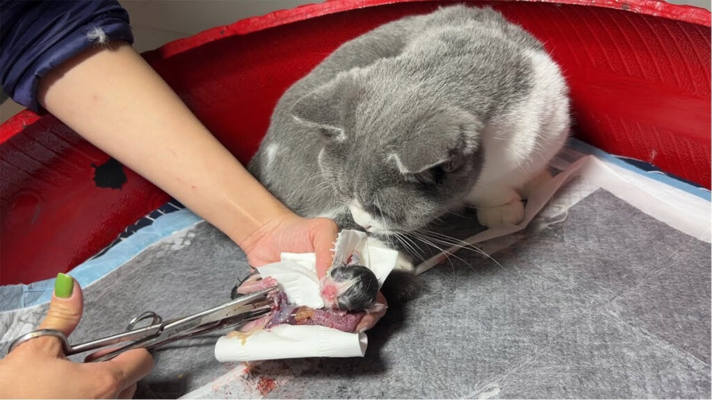 The room grew still as the miracle of life began. Luna’s breathing quickened; her instincts took over. The first tiny kitten arrived—wet, fragile, and blind, letting out the faintest cry. Gently, Luna began to lick her newborn clean, warming it with her tongue and love. Soon, the little one was nestled safely against her belly, searching for milk.