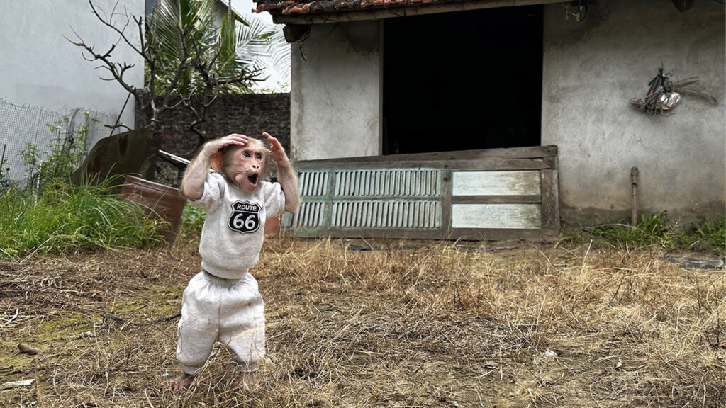 Lala, the playful monkey, clung tightly to the cameraman’s shoulder, her bright eyes wide with excitement. She tilted her head, as if asking, “Can we go inside?” The cameraman chuckled, gently setting her down. “Alright, brave girl, let’s see what secrets this place is hiding.”