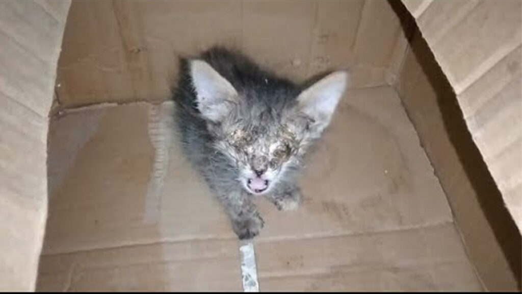 On a quiet evening, while walking down a narrow alley, a faint cry stopped the rescuer in their tracks. The sound was weak, desperate, and filled with pain. Following the voice, they found a tiny kitten huddled in a corner, his eyes sealed shut with thick crusts of infection. His frail body trembled, and every breath sounded like a struggle. It was clear—he was very sick, and if left untreated, he would soon lose his sight completely.
