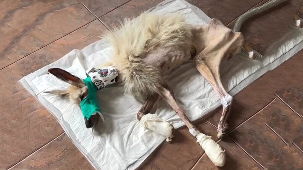 When rescuers first saw him, the dog was nothing more than skin and bones. His ribs pressed sharply against his fragile frame, and his dull eyes told a story of pain and hunger. He had been abandoned on the roadside, trembling and too weak to even stand. Many who saw him thought he wouldn’t survive another night. But deep inside that broken body, there was still a spark—a small, stubborn will to live.