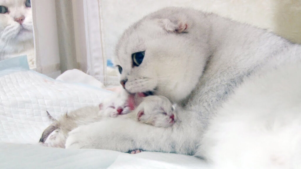 The first kitten arrived tiny and trembling, wrapped in its delicate birth sac. Misa worked quickly, cleaning the baby with tender licks until its first squeaky mew filled the room. A perfect silver kitten, ears still folded, pressed eagerly against its mother’s warm belly. Misa purred—a deep, vibrating sound of relief and pride.