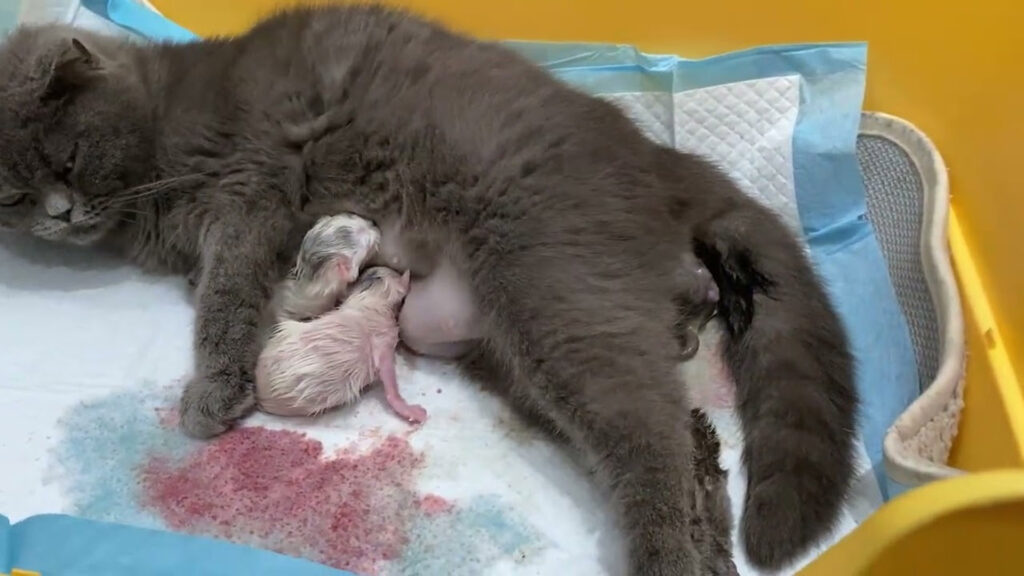 The quiet morning suddenly turned magical when Luna, the gentle gray mother cat, began pacing around the cozy corner of the living room. For days, she had been seeking soft blankets and warm spaces, and today, it was clear—her kittens were finally coming. Her owner, Mai, noticed Luna’s restless movements and quickly prepared a comfortable nesting box with clean towels and a warm lamp beside it.
