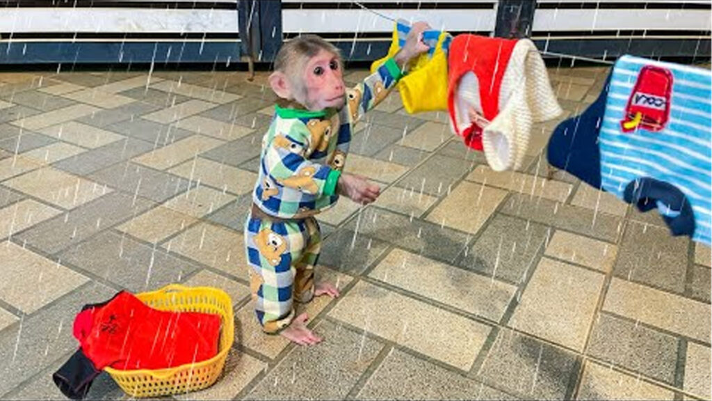 The clever little monkey dashed out to the yard, his tail curled tightly for balance. The first droplet of rain landed right on top of his head, making him squeal and move even faster. He hurried to the clothesline, reaching up with both hands to grab a shirt. It was a bit too tall for him… so he hopped, stretched, and finally managed to pull it down.