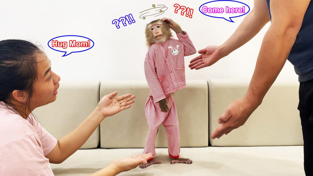 Monkey Lyly woke up with the sun gently warming her cheeks, stretching her tiny arms as she blinked sleepily. It was another beautiful morning—but today felt different. Today, she had two important people fighting for her affection: her beloved monkey mom, and the ever-present cameraman who always spoiled her with treats and attention.