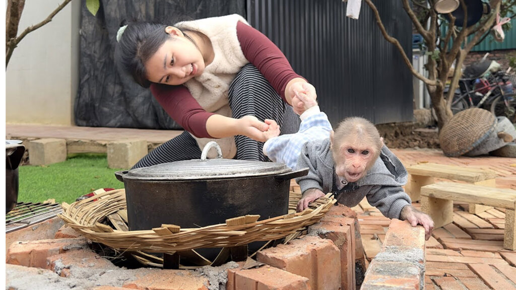 The rain had just stopped, leaving the whole yard sparkling with tiny droplets that clung to the leaves and grass like little diamonds. Lala, the curious and energetic baby monkey, pressed her face against the window, her eyes lighting up the moment she saw the damp but fresh outdoors. Cooking outside after the rain was her absolute favorite—the smell of wet earth, the cool breeze, and the fun of watching the smoke swirl into the open air. Today, she wanted nothing more than for Mom to cook outside.