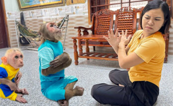 Baby Monkey climbed onto a chair to get a better view, tilting her head with curiosity. The baby let out a soft cry, and CUTIS immediately went into action. He gently rocked the crib, copying what he had seen Mom do many times before. It wasn’t perfect, but it was thoughtful. Meanwhile, Baby Monkey gathered the baby’s favorite toy and placed it carefully within reach, proud of her contribution.