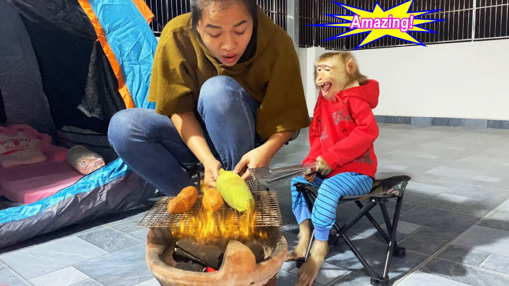 As the sun slowly dipped behind the city buildings, the rooftop was painted in soft shades of orange and pink. A gentle breeze carried the evening air, and high above the busy streets below, Monkey Lyly sat beside her mother, ready for dinner. The world felt quiet up there, as if the rooftop belonged only to the two of them.