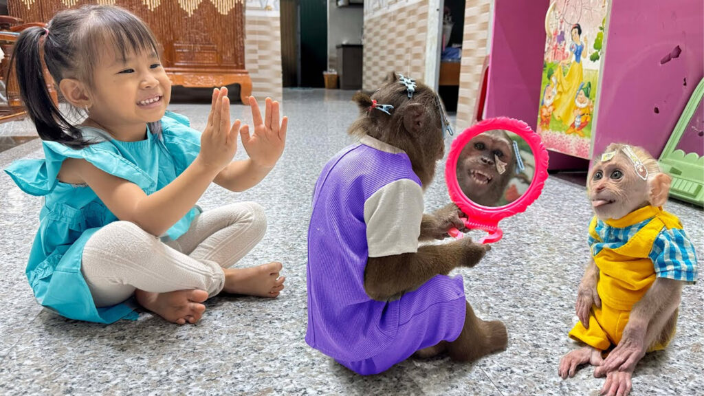 Yen Nhi gently sat them down side by side on the mat. With the seriousness of a professional stylist, she opened her bag and pulled out a soft brush, a toy mirror, and a few harmless makeup items. CUTIS tilted his head, watching closely, while BuEm reached out, trying to grab everything at once.