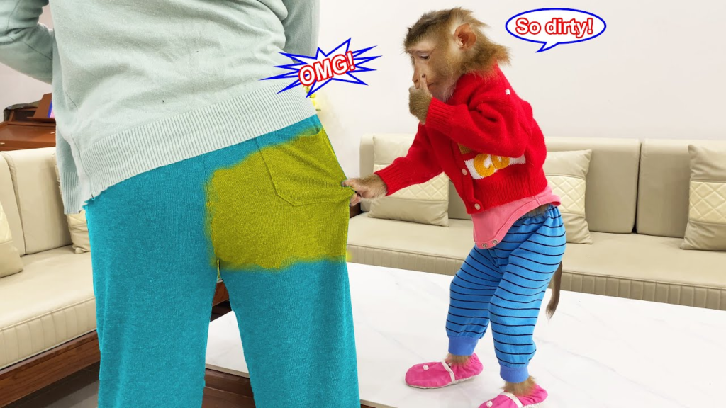 It was a quiet afternoon when Monkey Lyly noticed something unusual. Her mother had just come home from working outside, and her pants were covered in dark stains of mud and dust. To Lyly, who was still small and innocent, the sight was shocking. She froze in place, her big eyes fixed on her mother’s legs, her face full of confusion and worry.