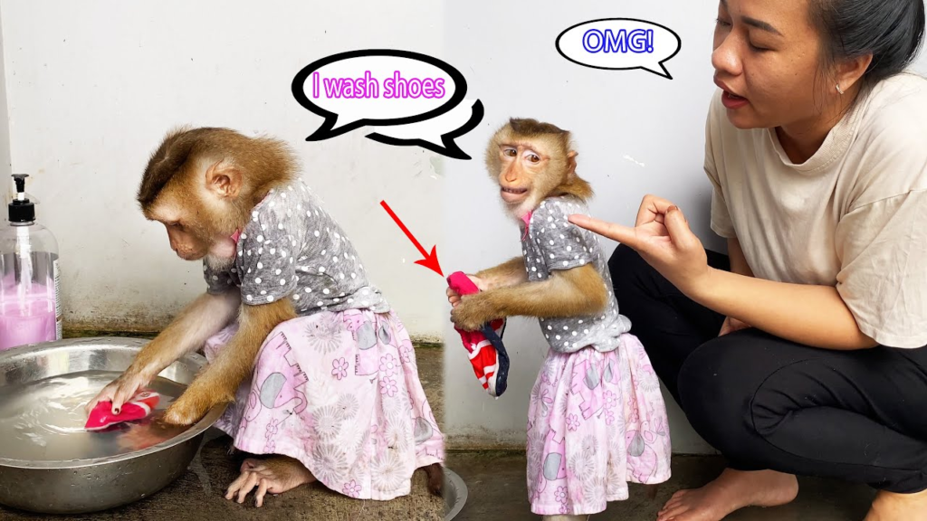 Monkey Lyly Hurriedly Washed Her Dirty Shoes While Her Mother Was Not Home Yet