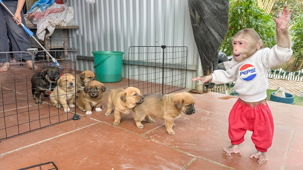 The morning began with cheerful chaos as Mom prepared to clean the puppies’ living space. Buckets, towels, and cleaning tools were lined up, and the puppies bounced around excitedly, not knowing what all the fuss was about. That’s when LaLa stepped in—self-appointed supervisor, serious guardian, and proud protector of the little ones.