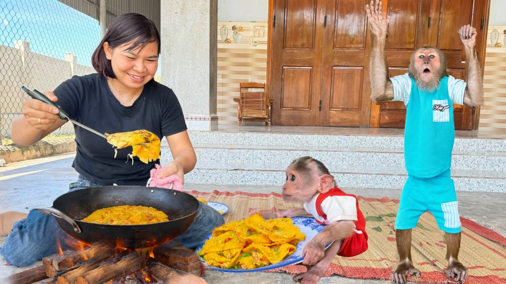The morning began with CUTIS bouncing around the house in excitement, his little monkey tail swaying happily as he announced his big plan for the day. Today wasn’t just any day—it was market day, and CUTIS had one delicious mission in mind: convincing Mom to cook Banh Xeo, the famous Vietnamese sizzling pancake he loved so much. Just thinking about the crispy edges and savory filling made his tummy rumble.