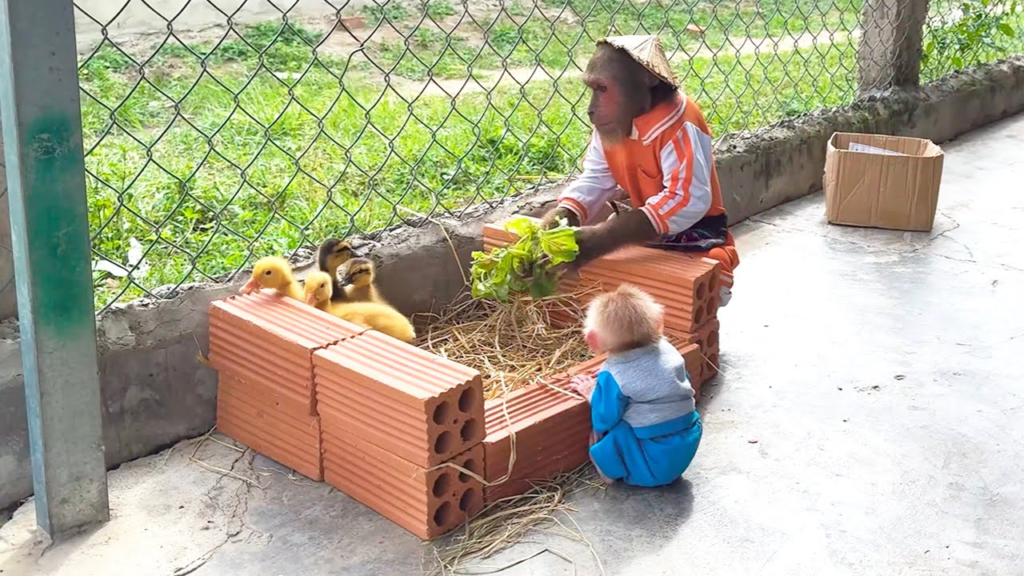 Dad showed them how to sprinkle the food gently on the ground. CUTIS listened closely, nodding seriously, while the baby monkey copied every movement, sprinkling a little too enthusiastically and making everyone laugh. The ducklings rushed toward the food, pecking happily, completely unaware of how much love surrounded them.