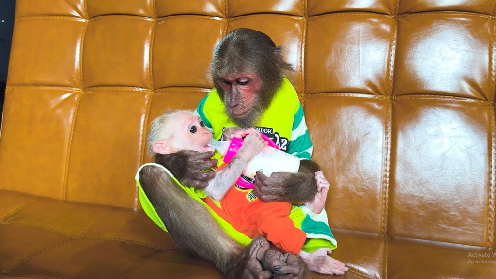 CUTIS helped prepare the milk, carefully shaking the bottle and checking the temperature before handing it to her. Baby Monkey drank eagerly, her worries instantly forgotten. Watching her enjoy every sip filled CUTIS with happiness and pride. He had turned a simple errand into a meaningful act of love.