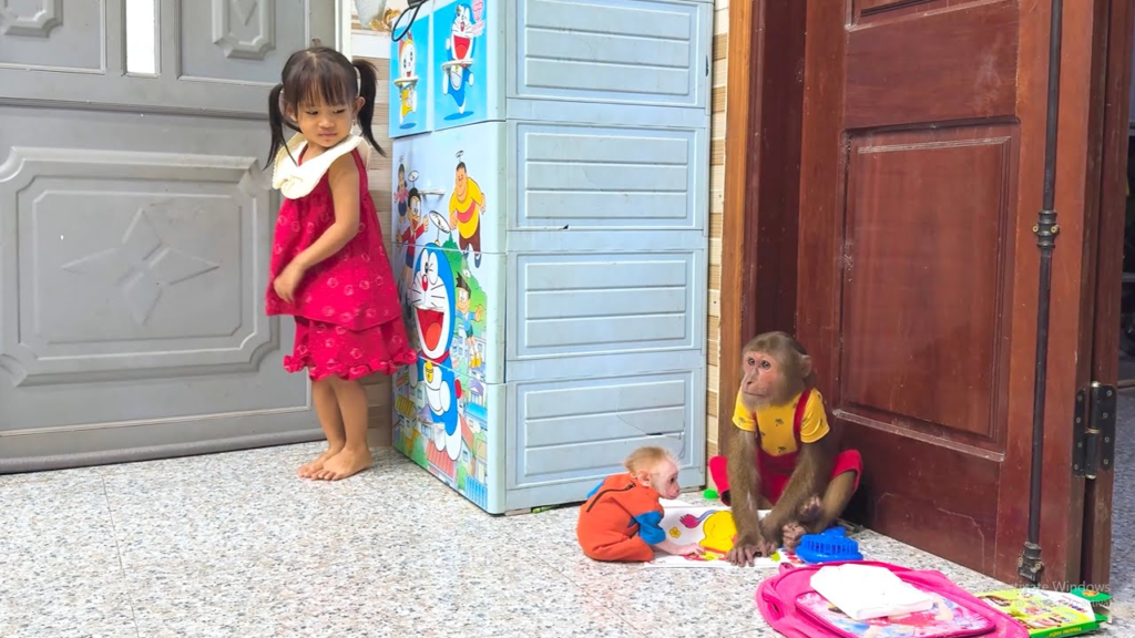 Meanwhile, outside the door, CUTIS and Baby Monkey were whispering excitedly. They had spotted Yen Nhi’s treasures earlier and couldn’t resist their curiosity. With sneaky steps and giggles they tried to hide, they slowly crept into the room. CUTIS reached for a glittery sticker, while Baby Monkey gently poked one of the soft hair bows.