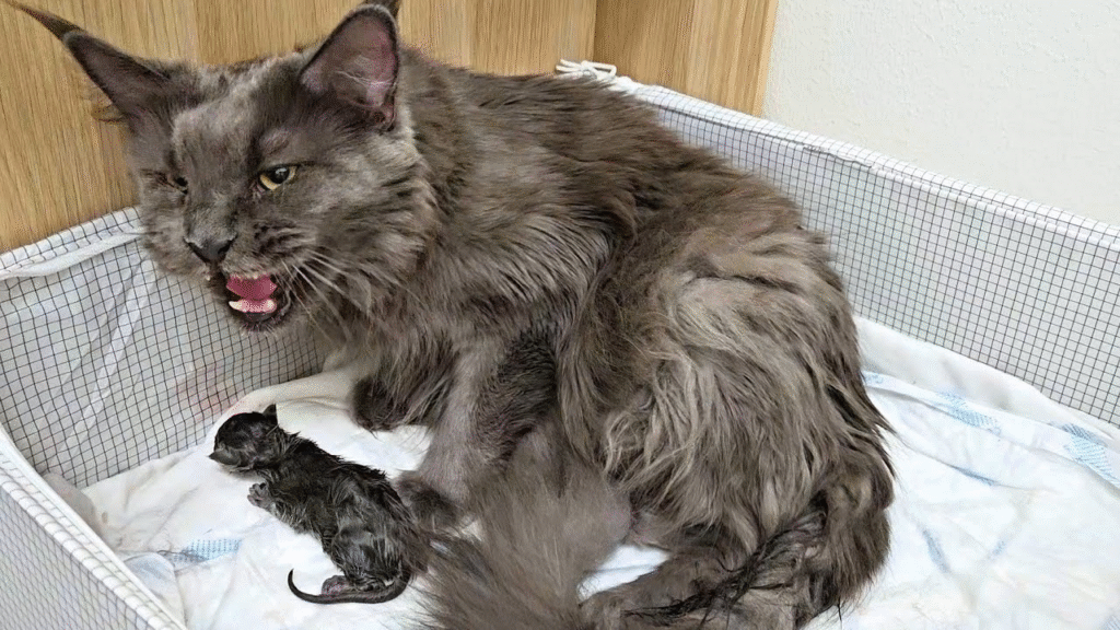 Luna, a majestic Maine Coon with a luxurious silver coat and bright green eyes, had always been the queen of the household. Her gentle temperament and intelligent eyes made her beloved by everyone who met her. As her belly grew rounder over the weeks, it became clear that Luna was expecting her first litter of kittens, and the whole family waited with excitement.