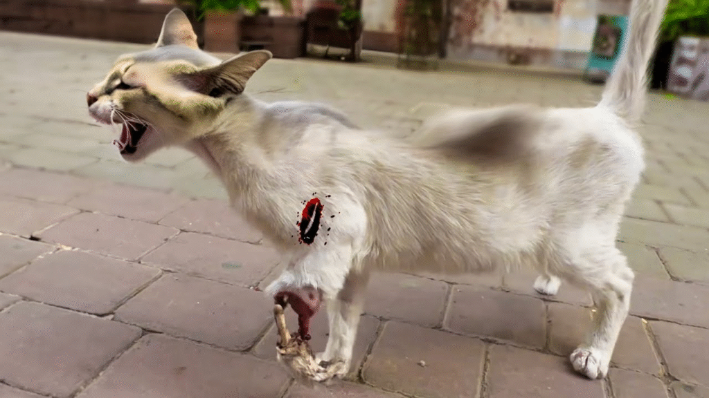 It was a rainy afternoon when we first saw her—huddled beneath a bush near the park, soaked to the bone and trembling. Her fur was matted with mud and blood, and one of her back legs hung at a terrible angle. It was clear that she was in pain. Her leg looked nearly severed, possibly from a trap or a car accident. We knew we had to act quickly.