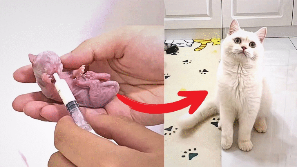 When the man found the tiny kitten, it looked more like a fragile wisp of life than a newborn. No bigger than the palm of his hand, the premature kitten wasn’t meowing—just gasping for breath, its body trembling and eyes still shut. Most would’ve assumed it wouldn’t survive the night. But the man didn’t walk away. Instead, he gently scooped her up, wrapped her in a soft cloth, and took her home.