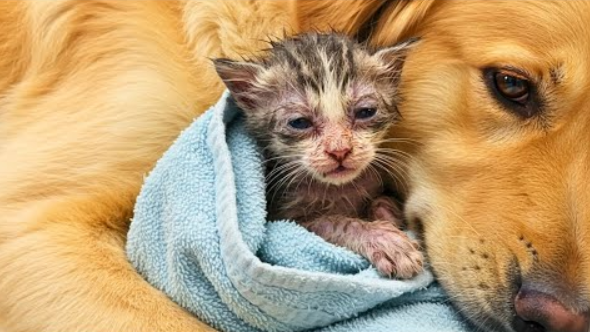 At a small animal clinic on the outskirts of town, an unusual pair captured everyone’s attention — a gentle golden retriever named Max and a tiny kitten named Luna. The staff had seen many friendships between animals, but nothing like this. Max, who had been brought in for a routine checkup, refused to leave Luna’s side after seeing her for the first time. What shocked everyone most was how he kept wrapping his paws around her every time she cried, pulling her close into a warm, comforting hug.