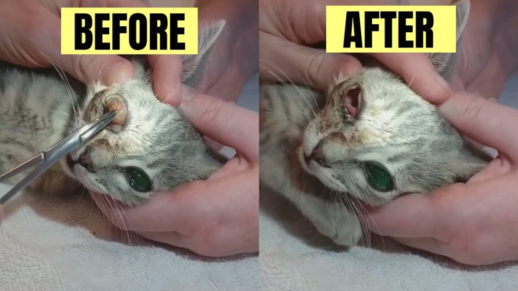 Although the larva was successfully removed, the damage it had caused was devastating. The infection, pressure, and trauma to the eye were too severe—both of the cat’s eyes had been affected, and his vision could not be saved.