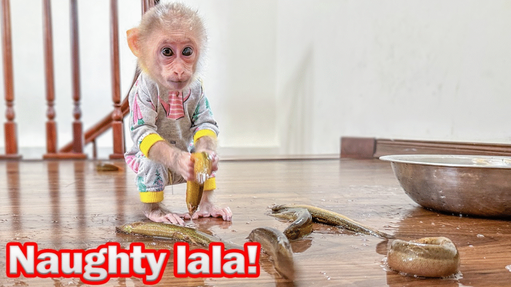Lala, the playful little monkey, was having one of her most exciting mornings yet. As the sun streamed through the trees, a soft bubbling sound caught her attention near a shallow stream behind the house. Her eyes lit up with curiosity as she spotted something wiggling under the clear water. It was a group of loach fish, darting back and forth between the pebbles!