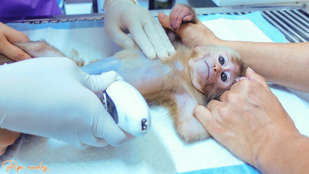 Tiny Poki, the baby monkey with big round eyes and soft brown fur, had always been full of energy. He loved climbing trees, chasing leaves, and cuddling with his mom. But today was different. This morning, his caretaker gently wrapped him in a soft blanket and whispered, “It’s time for your first checkup, little one.”