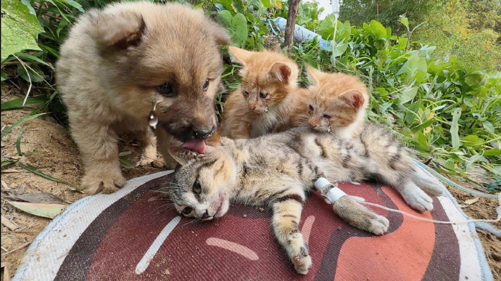 As we approached, I heard faint cries—high-pitched, desperate, and heartbreaking. Hidden behind the tall grass were two tiny kittens, barely a week old, curled up next to their mother who lay motionless. Their eyes were barely open, their fur soaked from the morning dew, and their cries—oh, their cries—were full of despair. They were nudging their mother, hoping she would respond. But she didn’t. She was weak and barely breathing, clearly at the edge of her life.