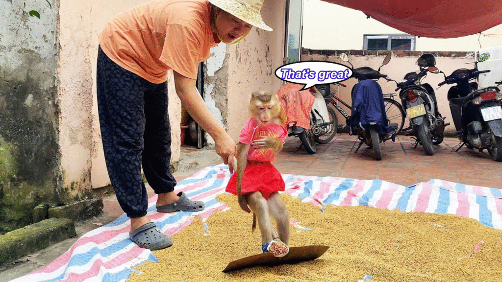 Monkey Lyly is no ordinary little monkey—she’s clever, quick, and always eager to lend a hand. One sunny morning, Lyly noticed her mother struggling to carry a big basket of freshly harvested rice to the yard to dry. Without being asked, Lyly rushed over, eyes wide with excitement and determination. She may be small, but her heart is big, and she was ready to help.