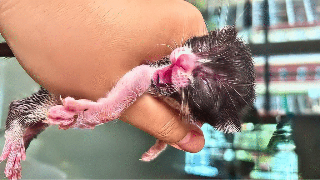 The tiny newborn kitten lay motionless on the cold ground, her eyes still closed, her body no bigger than a human hand. She had been abandoned—no mother in sight, no siblings nearby. Her soft cries were weak but desperate, tiny meows pleading for help. Passersby didn’t notice the fragile life hidden behind a row of trash bins, but she kept crying, her instinct telling her not to give up.
