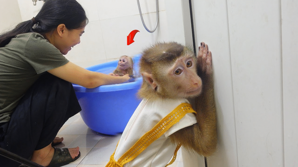 With gentle hands, she picked him up and lowered him into the tub. Pupu’s eyes widened at first—the water was warm, and he hadn’t expected the sensation. But the moment his mom started rubbing his back softly and talking to him in her calm, sweet voice, he completely relaxed.