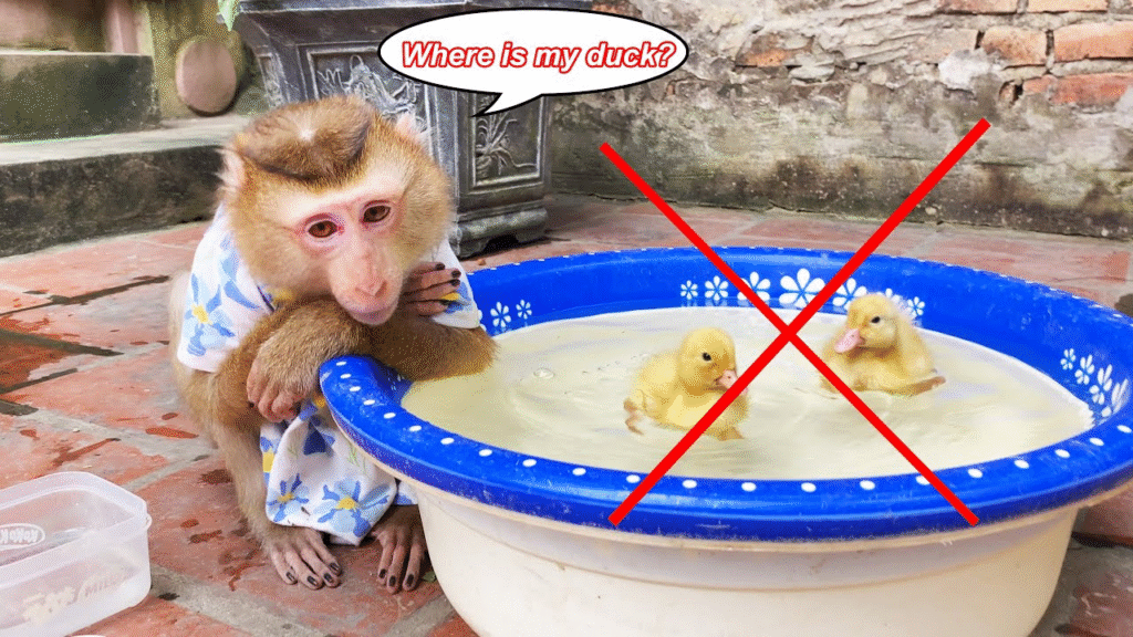 It was a calm, sunny morning when Monkey Lyly came out to play near the pond, where her feathered friends, the ducks, usually gathered. Every day, Lyly would greet them, splash in the shallow water, and watch them waddle around with their happy quacks. But today, something was different—there was no sound, no movement, no ducks.