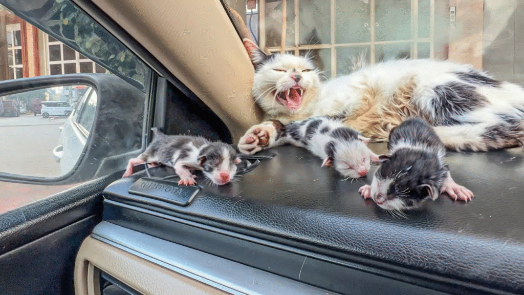 It started with a soft meow under the hood. I thought maybe it was the neighbor’s cat, hiding from the sun. But when I popped open the hood of my car, I found her—an intense-eyed, scrappy stray mother glaring at me with all the fury of a lioness. Nestled beside her were four tiny kittens, squirming and squeaking for milk. My car, apparently, had become her new maternity ward.