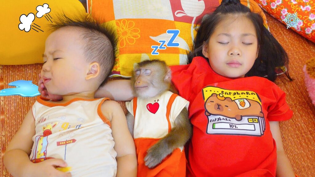 Little Monkey Pupu is always full of surprises, and today’s moment melted everyone’s heart. As the sun dipped low and the house began to quiet down, Pupu decided it was the perfect time to get cozy—but instead of heading to her usual sleeping spot, she had a different idea in mind. She waddled over with her soft toy in hand and quietly climbed onto the bed where Nguyen and Mun were already snuggled in.