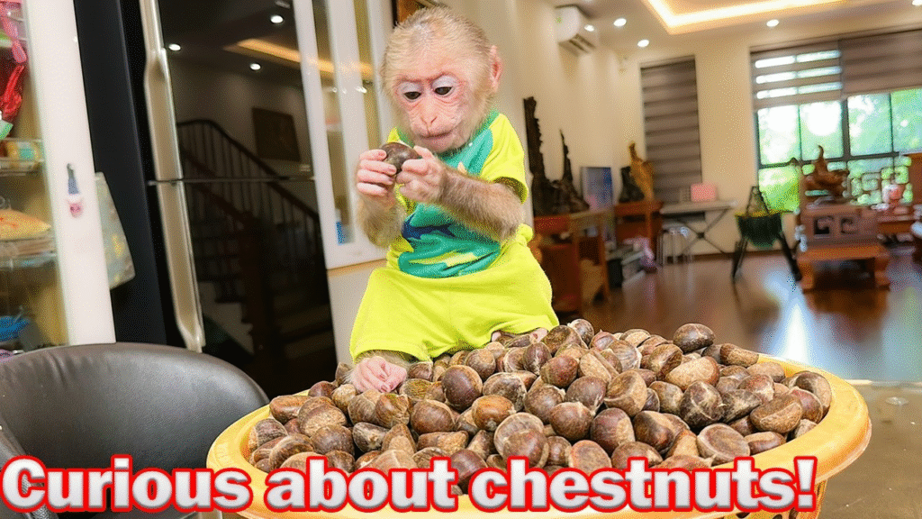 It was a calm afternoon when little Lala the monkey was playing near the kitchen, as usual, curious and full of energy. That’s when she noticed a small basket filled with shiny, round things she had never seen before. She tilted her head, poked at them gently, and looked up at Thuy with wide, wondering eyes.