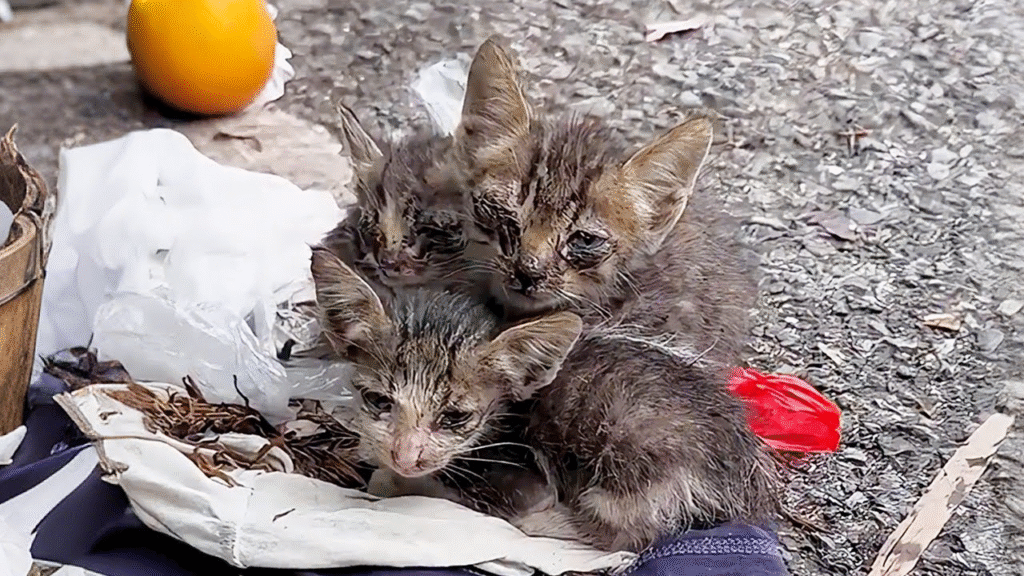 There, huddled together in a filthy cardboard box, were three tiny kittens. They were barely alive. Their fur was matted with grime, crawling with fleas, and their eyes—dear God—their eyes were sealed shut with thick, crusted infection. They couldn’t see. They couldn’t cry out. But they were breathing, just barely, and instinctively clinging to each other for warmth and comfort.