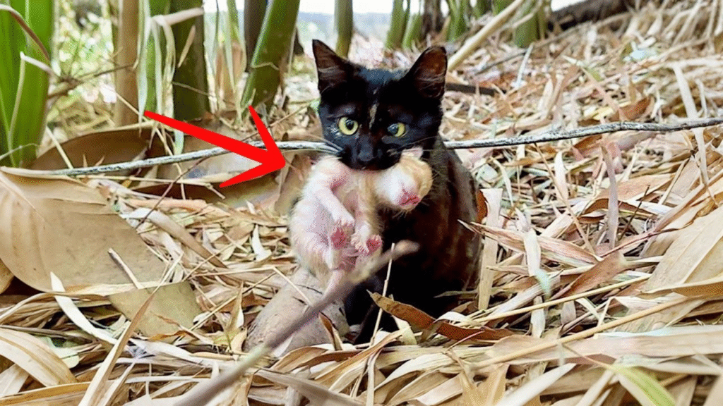 I followed the sound carefully, stepping over old boxes and debris, until I reached a pile of wood and tattered blankets shoved in the corner. The crying was louder now, frantic. I gently moved aside a piece of cloth—and there she was. A skinny, frightened mother cat, her eyes wide with worry. She looked straight at me, not with fear, but with a silent plea.