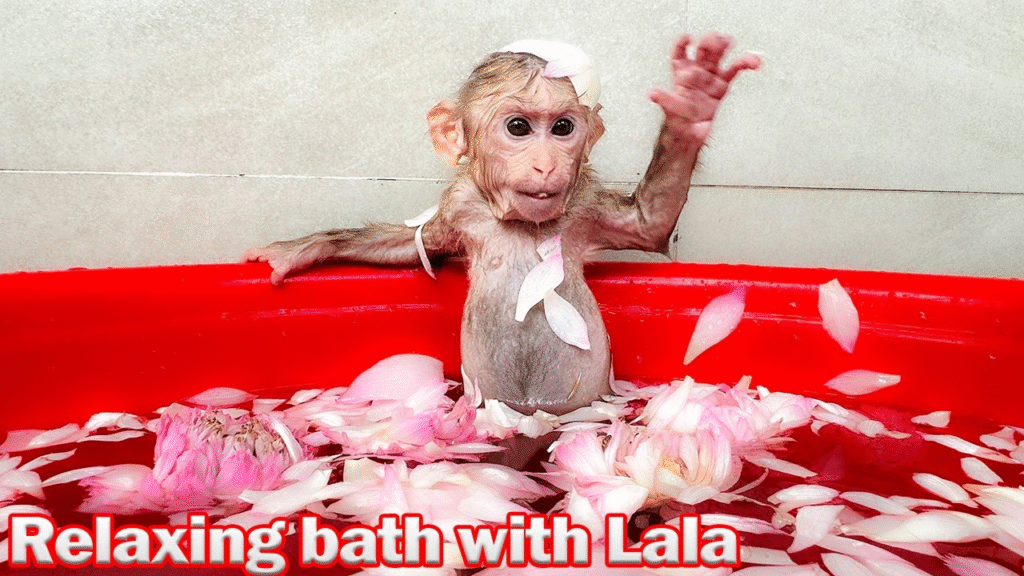 It was time for a bath—and not just any bath, but a special spa-like experience just for Lala. Mom filled the tub with warm water and added some gentle baby soap. Lala pouted at first, not too fond of baths, but as soon as the warm water touched her skin, she relaxed. Mom carefully scrubbed behind her ears, washed her curly hair, and even gave her a gentle paw massage.