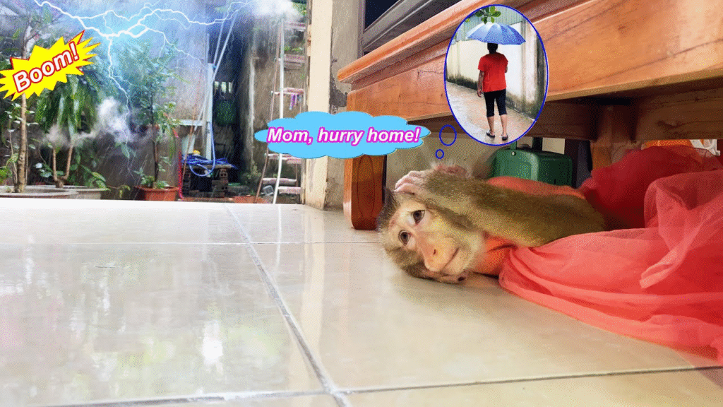 The sky had turned dark much earlier than usual. Heavy clouds gathered above, rumbling with thunder, and the wind howled through the trees. Inside the little house, Monkey Lyly sat by the window, her small hands pressed against the cold glass. Her big eyes stared out into the stormy world, searching for one face—Mom’s.