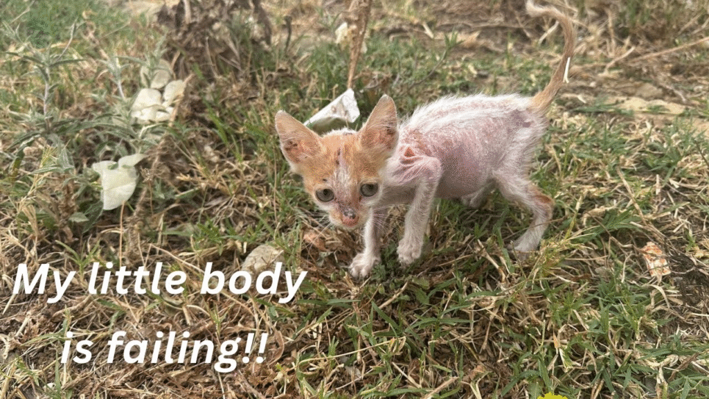 She was barely bigger than a hand. Her tiny, fragile body dragged itself across the cold pavement, each movement slow and painful. There was no fur to protect her—just raw, exposed skin marked with patches of scabs and wounds. Her eyes, large and glassy, silently screamed for help. Furless. Shelterless. Alone in a world far too harsh for such a tiny soul.