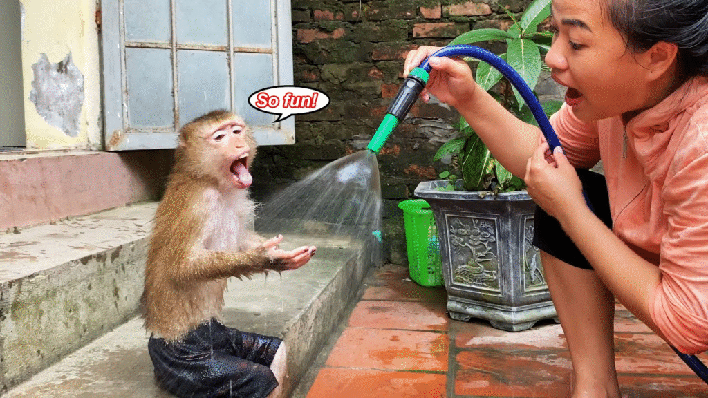 At one point, Lyly accidentally splashed water all over herself and mom, and they both burst into giggles. But that didn’t stop the hardworking monkey! She wiped her face, then got right back to scrubbing.