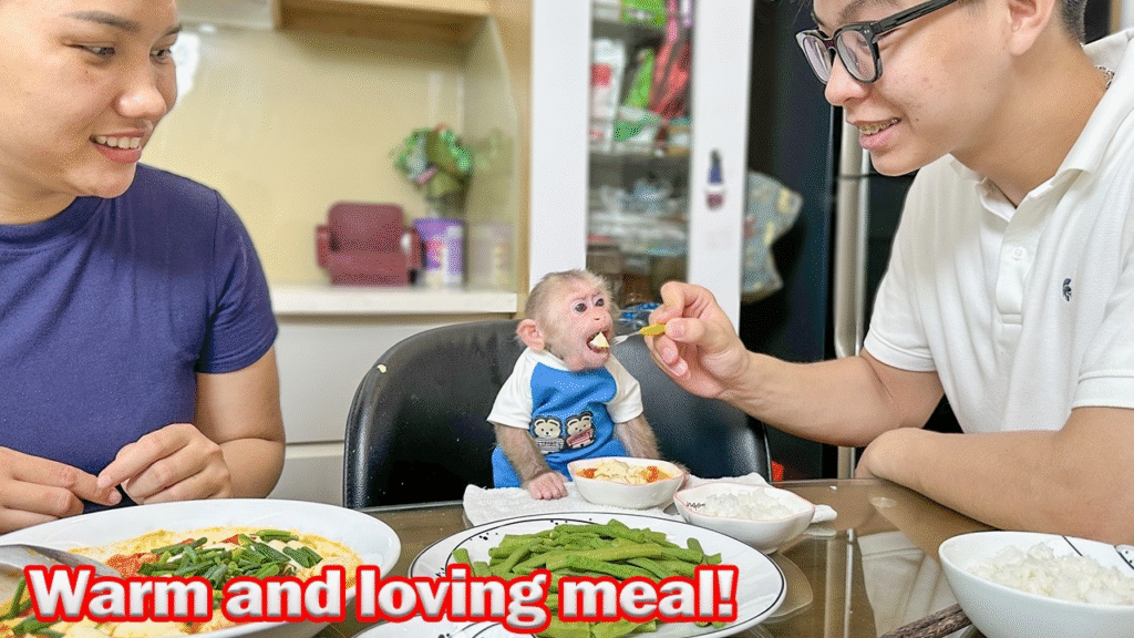 Without hesitation, Kien gently scooped her up and carried her to the cozy little dining area he had prepared. The table was set with their favorites—Lala’s warm bowl of shredded chicken and soft rice, and Kien’s comforting plate of rice, vegetables, and grilled fish. He sat her on a soft cushion beside him and lovingly placed her dish in front of her. Lala looked up at him, then down at her food, and let out a soft, grateful meow.