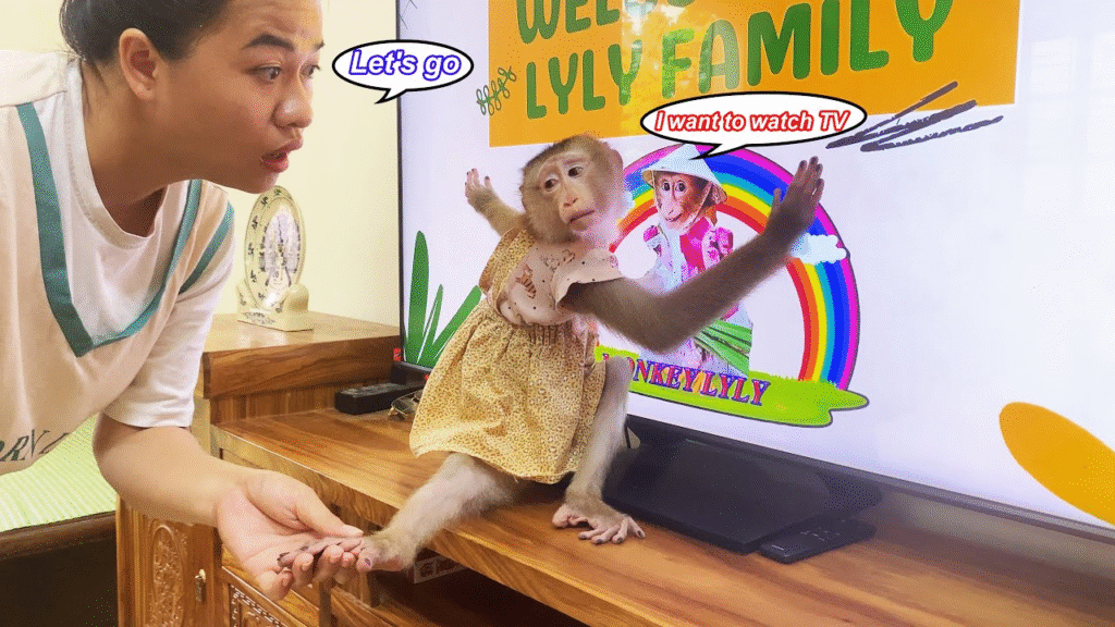 It was a sunny afternoon, and Lyly’s mother had planned a little outing. The sky was blue, the breeze was cool, and it seemed like the perfect day for a walk in the garden or maybe even a short trip to the nearby park. But inside the house, Monkey Lyly had her eyes glued to the screen, completely mesmerized. Her tiny hands clutched the remote, and her legs were curled up comfortably on her soft blanket. It didn’t matter what show was playing—if the TV was on, Lyly was all in.