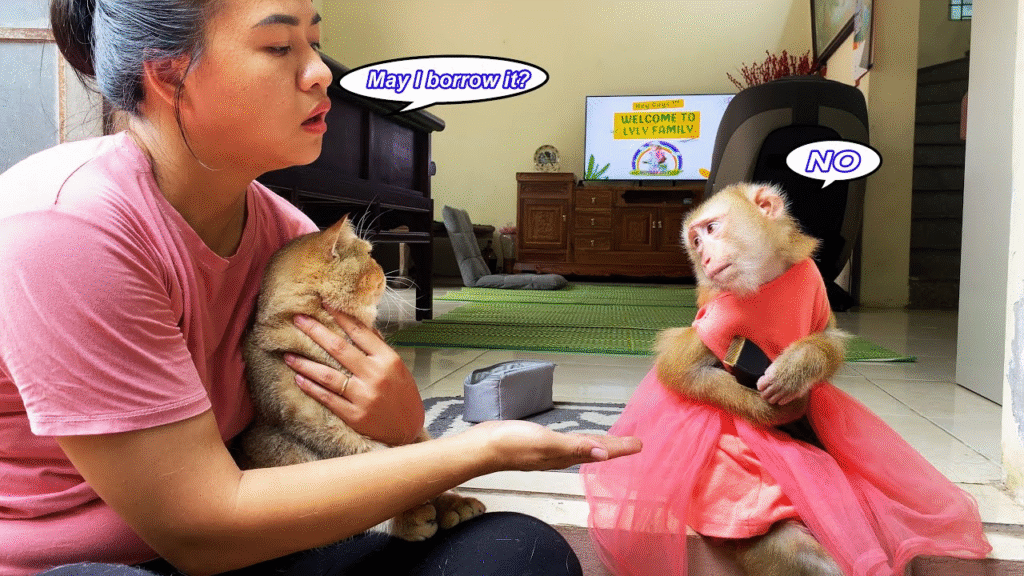 Monkey Lyly sat proudly on the floor, clutching the shiny hair clipper in her little hands like it was a treasure. Her mother called gently from across the room, “Lyly, sweetie, can I have the clipper now? Mommy needs to trim her hair.” But Lyly tilted her head and looked at the clipper with big, puzzled eyes. She didn’t move.