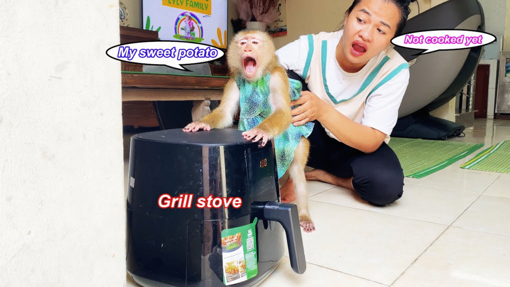 It was a chilly afternoon, and the sweet aroma of baked sweet potatoes filled the air around the little outdoor kitchen. Monkey Lyly had been waiting all morning, watching closely as Mom prepared the fire and carefully placed the sweet potatoes into the hot ashes. The scent was irresistible, and Lyly’s eyes sparkled with anticipation.
