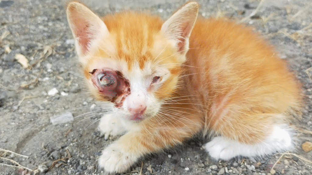 In a quiet corner of a busy alley, hidden behind trash bins and broken crates, a tiny kitten sat trembling. Her fur was thin and patchy, her body weak, and one of her eyes bulged unnaturally from its socket—swollen, infected, and clouded over. Every time someone passed by, she let out a soft, pitiful cry, as if begging for someone—anyone—to notice her. But no one stopped. No one dared to help.